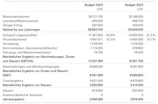 Erstvermietungen im Himmelrich und im Obermaihof, die Integration der Liegenschaften Sagenmatt und die anstehende Erstvermietung der oberen Bernstrasse werden unsere kaufmännische und technische Bewirtschaftung vor grosse Herausforderungen stellen. Der Personalaufwand ist infolgedessen in geringem Mass angepasst, damit sowohl diese Aufgaben als auch die Projekte im Zusammenhang mit der Einführung der neuen Statuten oder der Kostenmiete professionell und in guter Qualität ausgeführt werden können. Im Bereich Kommunikation ist ein erster wesentlicher Posten für das Jubiläum 2024 eingestellt.