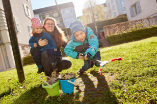 Wenn aus dem Güselsammeln Spiel wird: Jessica Amberg mit ihren Kindern unterwegs.