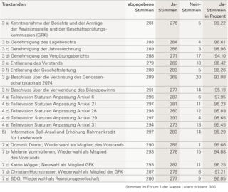 An der 101. GV am 2. Juni im Forum der Messe Luzern waren 300 Stimmen vertreten. Anträge von den Mitgliedern waren keine eingegangen. Die GV verlief ruhig und war nach knapp zwei Stunden zu Ende. Alle traktandierten Geschäfte und die Wahlen gingen glatt über die Bühne (Resultate weiter unten). Die gute Arbeit und die transparente Kommunikation der abl-Verantwortlichen wurden immer wieder mit Applaus gewürdigt.