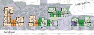 Zwischen Haus B und C spannt sich der 700 Quadratmeter grosse Quartierplatz (Teil BG Matt orange, Teil abl grün).