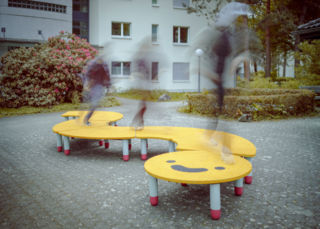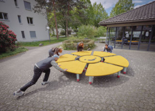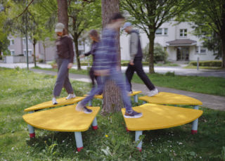 Damit die Freude lange hält, wurde auch bei diesem Prototyp (vgl. magazin Juni 2024) auf widerstandsfähiges Material gesetzt. Die leuchtgelbe Oberfläche aus EPDM-Granulat behält ihre Farbe bei Sonneneinstrahlung. Dank der massiven Holzfüsse tragen die Elemente problemlos mehrere Personen. «Smile» kann als Plattform für kleine Siedlungskonzerte und Yoga dienen oder in Einzelteilen als Bank oder niedriger Tisch genutzt werden. Die einzelnen Teile sind im Nu auf der Unterseite verstrebt!