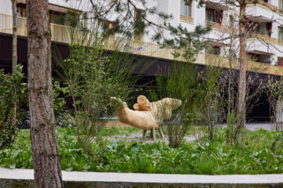 Es könnte ein Wal sein, ein Kamel oder ein Fischreiher: Das Eichenholz aus dem Jura hat seine Gestalt angenommen. Die drei Skulpturen von René Odermatt sind im Innenhof der Siedlung Himmelrich 3 eingezogen.