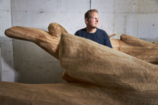 orientiere. Beim Grobschnitt nahm ich jeweils eine Fettkreide in die Hand und markierte einzelne Punkte. Schliesslich ist es aber ein ständiges Beobachten der Form, ein Abgleichen und Weiterarbeiten.» Nach zwei Wochen tauschte er die grosse Benzin-Motorsäge schliesslich gegen kleinere Akku-Motorsägen ein.