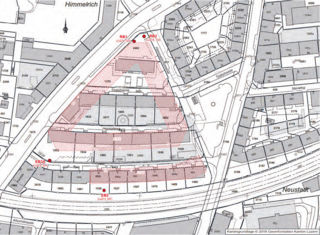 Die roten Punkte markieren die Entnahme- und Rückgabebrunnen für die Zu- und Rückleitung des Grundwassers.