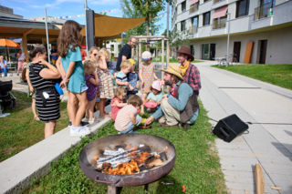 Die Jubiläumsaktivitäten der abl sind eine gute Gelegenheit, neue Quartiere zu entdecken. So etwa am 7. September den rundum erneuerten Obermaihof, wo unter freiem Himmel ein Kinderkonzert und eine Puppengeschichte auf dem Programm standen. Bevor es losging, lud an diesem sommerlichen Samstagnachmittag eine Sirupbar im neuen Pavillon mitten in der Siedlung zu einer Erfrischung. Dazu gabs Apfelschnitze, Guetsli und für die Erwachsenen altersgerechte Getränke.