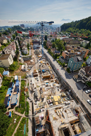 Die anspruchsvollen Bauarbeiten sind auf Kurs. Die Hanglage und die unterschiedlichen Niveaus der drei neuen Längsbauten im Obermaihof verlangen den Verantwortlichen einiges ab. Die Tiefbau- und Hochbauarbeiten laufen parallel und nicht wie üblich nacheinander. Die Schnittstellen bedürfen grosser Aufmerksamkeit, damit die Arbeiten geordnet Hand in Hand vonstatten gehen.