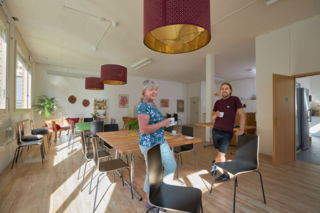 B102-Besitzerin Gertrud Küng und abl-Soziokultur-Praktikant Gabriel Duss im neuen Treffpunkt.