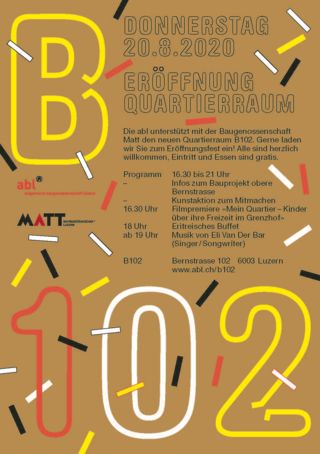 Die abl beteiligt sich mit der Baugenossenschaft Matt am B102 und wird den Raum regelmässig nutzen – etwa als Sitzungszimmer während der Bauphase oder für Info-Anlässe zum Bauprojekt. Deshalb trägt sie das Eröffnungsfest mit, welches am 20. August 2020 dort stattfindet. Gabriel Duss hofft auf einen schönen Sommerabend mit den Menschen aus dem Quartier: «Der Anlass ist ein Auftakt, der die Bewohnerinnen und Bewohner des Quartiers zusammenbringen soll und sie dazu einlädt, den Raum kennenzulernen und für ihre Bedürfnisse zu nutzen.» Am Anlass wird auch der Film «Mein Quartier – Kinder über ihre Freizeit im Grenzhof» gezeigt, den Duss gemeinsam mit der Quartierarbeit umsetzte.
