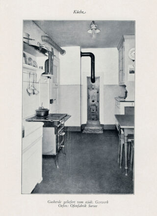 Auch die abl setzte von Anfang an auf moderne Küchenausstattung, die sie im Juli 1932 wie folgt bewarb: «Die Küchen enthalten Küchenschrank, Schüttstein mit Tropfbrett, Gasherd, Kochofen, Pfannenregal oder Pfannenschrank, elektr. Stecker für Glätteisen etc. und einen Belag von weißen Plättli ob Gasherd und Schüttstein.» Das Bild aus einer Broschüre von 1930, vermutlich aus einer Wohnung am Neuweg, zeigt diese Einrichtung inklusive «Gasherde geliefert vom städt. Gaswerk» sehr schön.
