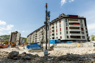 Bis Ende Mai dürften die Rückbauarbeiten an der Claridenstrasse erledigt sein. Bereits sind auf dem Gelände Spezialisten mit einer 95 Tonnen wiegenden Spezialmaschine mit dem Pfählen beschäftigt. Der Untergrund ist teilweise schwierig; Kiesschichten, hart wie Fels, sind eine Herausforderung. Bis jetzt lief jedoch alles glatt. Mitte Juni sollten die Pfahlarbeiten beendet sein. Gleichzeitig werden die Fundamente für zwei Kräne vorbereitet.