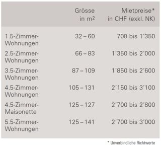 Am 15. September 2018 startet die Erstvermietung für die Himmelrich-3-Wohnungen. Zum selben Zeitpunkt werden die definitiven Mietpreise kommuniziert. Diese variieren je nach Lage und Wohnungsgrösse. Die folgende Tabelle gibt erste, unverbindliche Anhaltspunkte.