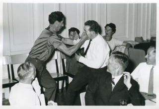 Der abl-Ausflug aus den 1950er- oder 1960er-Jahren in die Ostschweiz war bereits letztes Jahr einmal Thema dieser Rubrik. Die vielen lachenden Gesichter auf den Fotos zeigen, dass die Stimmung sehr heiter gewesen sein muss. Und auch die hier abgebildete «Kampfszene» dürfte vermutlich Teil einer Abenddarbietung gewesen sein, wie die Reaktionen der Zuschauerinnen und Zuschauer «am Ring» vermuten lassen.