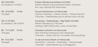 Abwechslungsweise bieten Edith Hausmann und Hansruedi Hitz Wanderungen an. Bei den Wanderungen mit Edith steht das Wandern im Vordergrund: Die Ausflüge ins Grüne sind ganztägig, mit einem Picknick unterwegs. Bei schlechtem Wetter werden Ediths Wanderungen aufs Ersatzdatum verschoben.